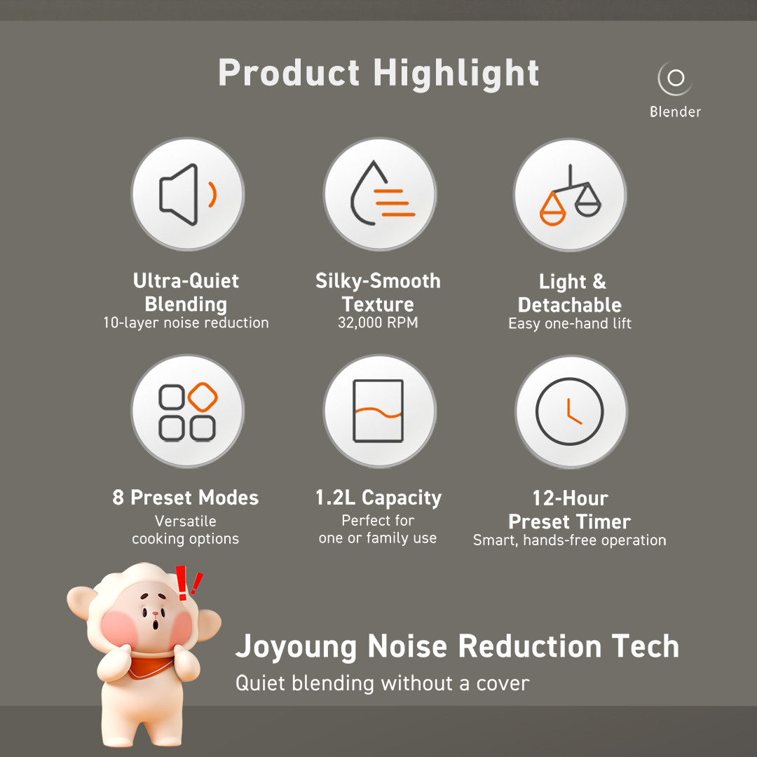 The Joyoung JPB-12B61 Hot & Cold Blender is a compact and powerful 1.2L multifunctional blender perfect for small families and modern kitchens. Equipped with a 32,000 RPM high-speed motor and 4 stainless steel blades, it delivers ultra-smooth results for smoothies, soups, soy milk, nut milk, and juice. With 8 preset hot & cold programs, a 10-layer noise reduction system (48dB), and a one-click cleaning function, it combines performance with quiet convenience. The keep warm function (55°C) and 6 turbulence ribs ensure consistent texture and ready-to-serve warmth. Sleek, efficient, and easy to maintain, the Joyoung JPB-12B61 is one of the best quiet multifunctional blenders in Malaysia for everyday healthy living.