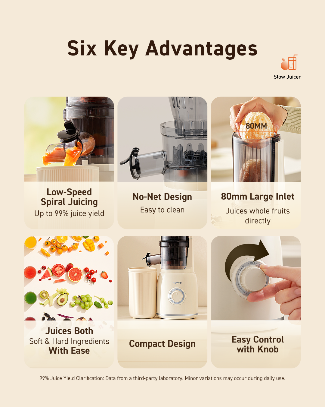 The 304 stainless steel spiral auger ensures up to 99% juice yield, while the innovative net-free filter design makes it an easy-to-clean slow juicer with no clogging or residue buildup. For added safety, the automatic cut-off system stops operation when the chute lid is open, ensuring worry-free use in every household.