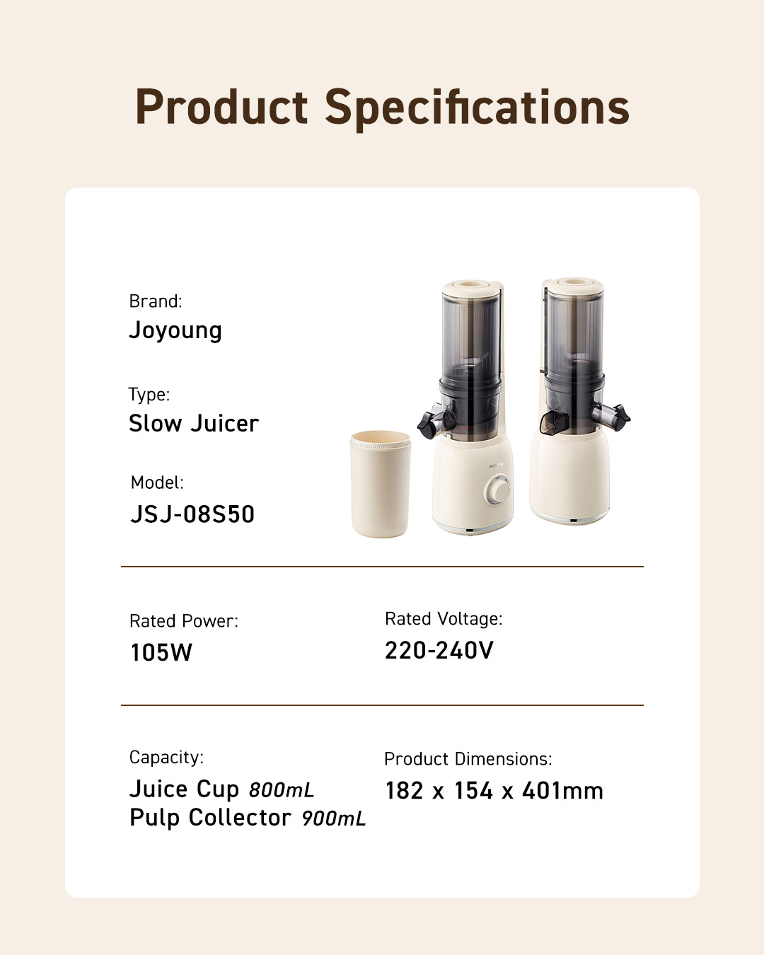 Upgrade your kitchen with the Joyoung JSJ-08S50 Slow Juicer. The high-yield, easy-to-clean, and multifunctional cold press juicer that delivers fresh, nutrient-packed juices every day. Your gateway to better health, effortless juicing, and delicious homemade beverages!